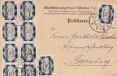Inland postcard from 25.01.1923 franked with 10 stamps a 2½ Mark (=25 Mark)
