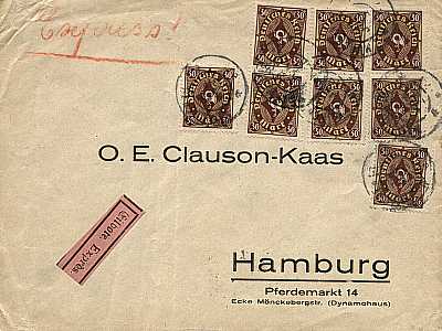 Inland cover with special delivery (21-100 g) from 28.06.1923 franked with 8 stamps a 30 Mark (=240 Mark, 120 cover 120 special delivery) |