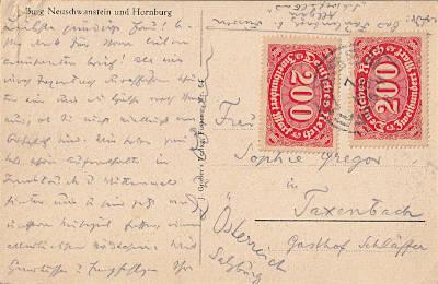 Foreign postcard from 07.08.1923 franked with 2 stamps a 200 Mark (=400 Mark)