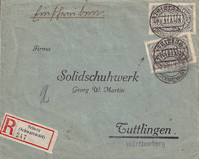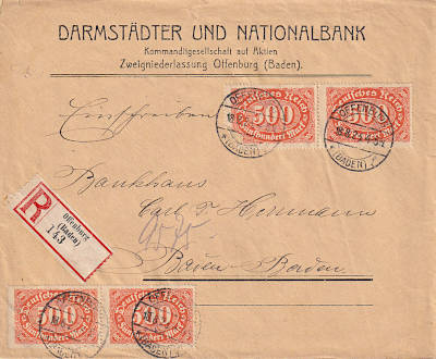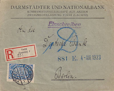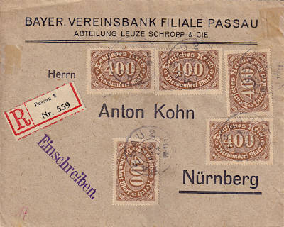 Inland cover with registeration (1-20 g) from 23.08.1923 franked with 5 stamps a 400 Mark (=2 000 Mark, 1 000 cover 1 000 registeration) |