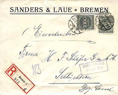 Inland cover with registeration (1-20 g) from 23.08.1923 franked with 2 stamps a 1 000 Mark (=2 000 Mark, 1 000 cover 1 000 registeration) |
