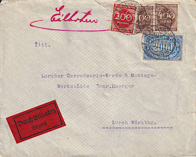 Inland cover with special delivery (1-20 g) from 21.08.1923 franked with 4 stamps(=3 000 Mark, 1 000 cover 2 000 special delivery)