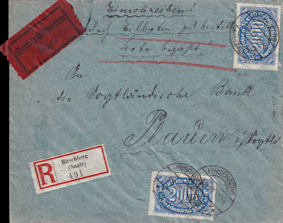 Inland cover with registeration and special delivery (1-20 g) from 03.08.1923 franked with 2 stamps a 2 000 Mark (=4 000 Mark, 1 000 cover 1 000 registeration 2 000 special delivery)