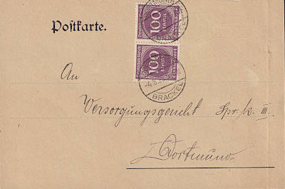 Local postcard from 04.08.1923 franked with 2 stamps a 100 Mark (=200 Mark)