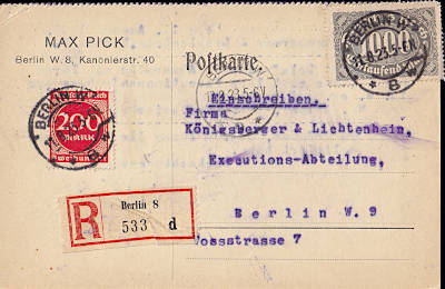 Ortspostkarte mit Einschreiben vom 11.08.1923 frankiert mit 2 Marken (=1 200 Mark, 200 Postkarte 1 000 Einschreiben)