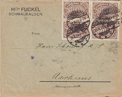 Auslandsbrief (1-20 g) vom 31.08.1923 frankiert mit 3 Marken a 20 000 Mark auf 200 Mark (=60 000 Mark) |
