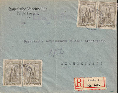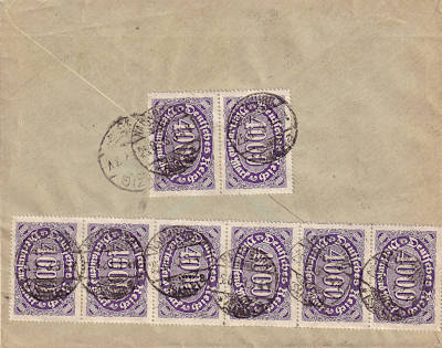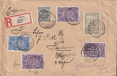 Inland cover with registeration (1-20 g) from 25.08.1923 franked with 10 stamps a 4 000 Mark (=40 000 Mark, 20 000 cover 20 000 registeration) |