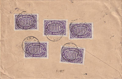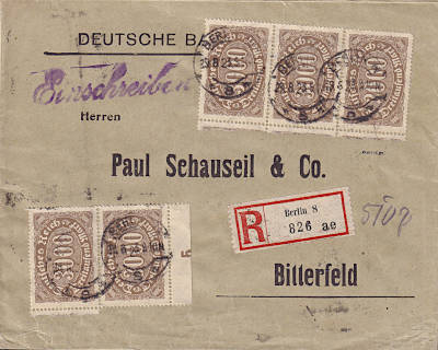 Inland cover with registeration (1-20 g) from 25.08.1923 franked with 8 stamps a 5 000 Mark (=40 000 Mark, 20 000 cover 20 000 registeration) |