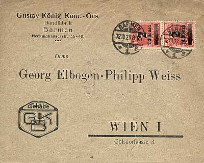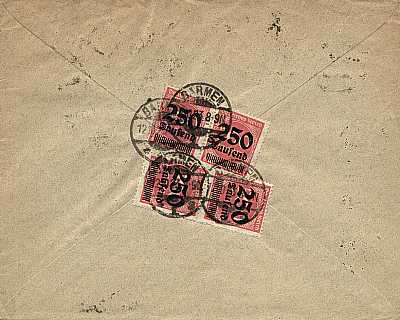 Foreign cover (1-20 g) from 12.10.1923 franked with 6 stamps (=5 Million Mark)