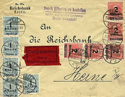 Inlandsbrief mit Eilzustellung (1-20 g) vom 15.10.1923 frankiert mit 10 Marken(=15 Millionen Mark, 5 Millionen Brief10 Millionen Eilzustellung)