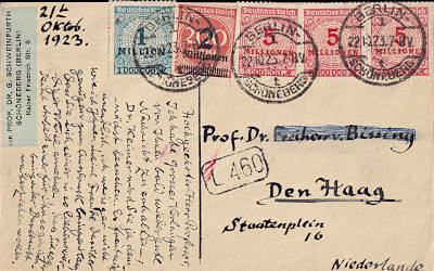 Foreign postcard from 22.10.1923 franked with 5 stamps (=18 Million Mark)