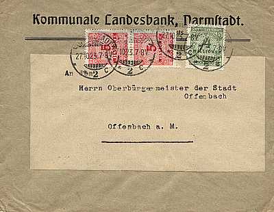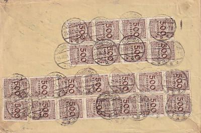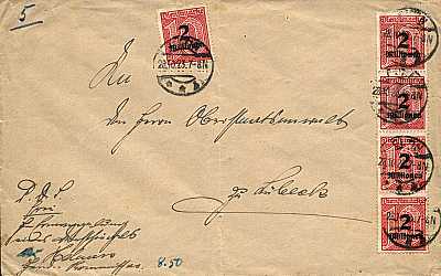 Inland cover (1-20 g) from 25.10.1923 franked with 5 stamps a 2 Million Mark on 200 Mark (=10 Million Mark) |