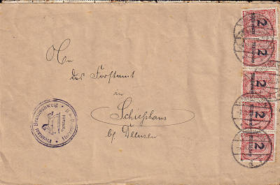Inland cover (1-20 g) from 03.11.1923 franked with 5 stamps a 20 Million Mark (=100 Million Mark) |