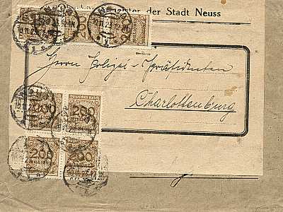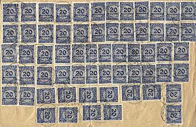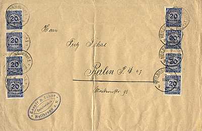 Inland cover (21-100 g) from 07.11.1923 franked with 70 stamps a 20 Million Mark (=1,4 Billion Mark) |