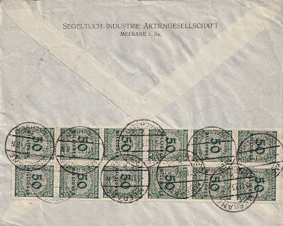 Inland cover (21-100 g) from 06.11.1923 franked with 55 stamps (=1,4 Billion Mark) |