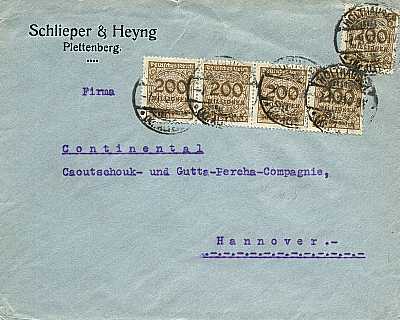 Inland cover (1-20 g) from 07.11.1923 franked with 5 stamps a 200 Million Mark (=1 Billion Mark) |