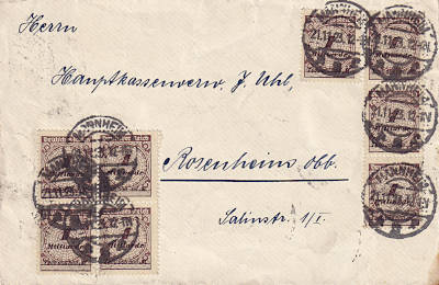 Inland cover (1-20 g) from 20.11.1923 franked with 2 stamps a 10 Billion Mark on 50 Million Mark (=20 Billion Mark) |