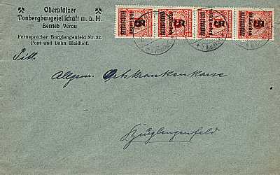 Inland cover (1-20 g) from 26.11.1923 franked with 4 stamps a 5 Billion Mark on 10 Million Mark (=80 Billion Mark)