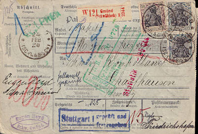 Auslandspaketkarte mit Wertangabe (3 500 Mark) (225 g) vom 24.02.1920 (4. Periode) frankiert mit 27 Marken (=20 Mark) |
