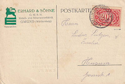 Inlandspostkarte vom 16.08.1923 (15. Periode) frankiert mit 9 Marken (=400 Mark) |