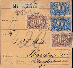 Inlandspaketkarte (1 500 g, > 75 km) vom 23.08.1923 (15. Periode) frankiert mit 4 Marken (=4 800 Mark) |
