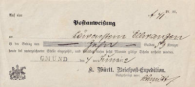 Einlieferungsschein für eine Postanweisung vom 04.07.1872; der Einzeiler wurde hier als Absenderortsangabe verwendet |