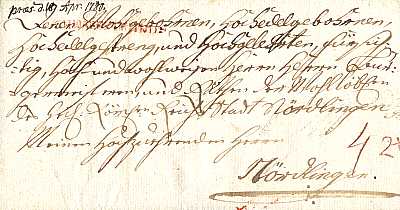 Brief mit Einschreiben vom 10.09.1799 nach Esslingen mit Rötelgitter rechts oben |