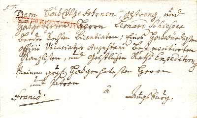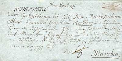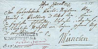 Brief mit Einschreiben vom 27.06.1806 nach München mit zusätzlicher roter handschriftlicher Ortsangabe und "CHARGE"-Nebenstempel |