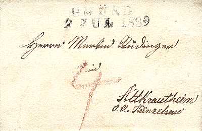 Brief vom 09.07.1839 nach Altkrautheim; in der Jahreszahl wurde anstatt der "3" eine "8" verwendet |