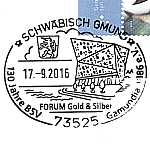 Ellipsenstempel mit 3 Striche (bo3zbu) "SCHWÄBISCH GMÜND/ (Stadtwappen Forum)/ (Datum)/ FORUM Gold & Silber/ 130 Jahre