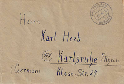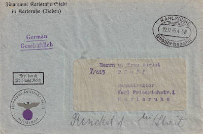 Karlsruhe (Baden) 1: Ortsbrief (1-20 g) vom 22.12.1945 mit schwarzem Zweiellipsensteg-stempel (bo2zbu) "KARLSRUHE/ (BADEN)1/ (Datum)/ Gebühr bezahlt" |
