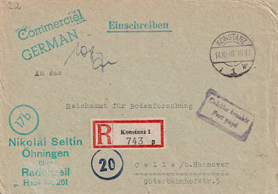 Konstanz 1: Inlandsbrief mit Einschreiben (1-20 g) vom 14.10.1946 mit violettem Rechteckstempel (2z) "Gebühr bezahlt/ Port payé" und handschriftliche Gebührenhöhe "108" |