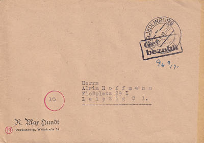 Quedlinburg: Inlandsbrief (1-20 g) vom 09.07.1948 mit schwarzem Rechteckstempel (2z) "Gebühr bezahlt"