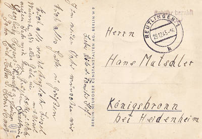 Reutlingen 1: Inlandspostkarte vom 29.12.1945 mit violettem Zweizeiler (2z) "Gebühr bezahlt/ 6 Rpf" |