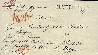 schwarzer Einzeiler "BEVERSTEDT" auf Paketbrief vom 02.05.1848 nach Wrestedt