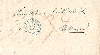 blauer Kreissegmentstempel mit Kreis "LEONBERG/ 15 NOV 1847" auf Brief nach Waiblingen |