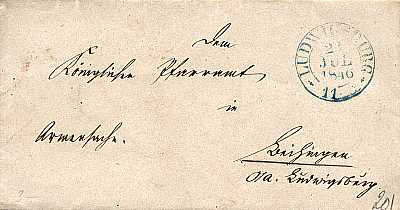 blauer Kreiskreisstempel "LUDWIGSBURG/ 23 JUL 1846" auf Brief nach Beisingen |