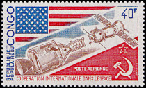 Apollo 18 and Soyuz 19 space capsules, American and Soviet flags