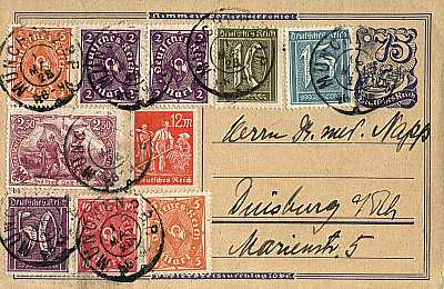 Auslandspostkarte frankiert mit einem Wertstempel und 10 Briefmarken |