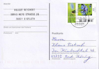 postcard franked with 2 the same postage stamps in violet/ orange or only violet |