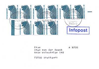 Info Letter / Infopost: fee reduced basic postal shipment whose content was only produced by mechanical or photomechanical reproduction (e.g. printing) |