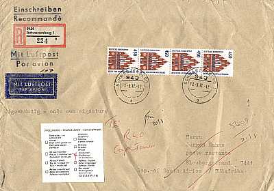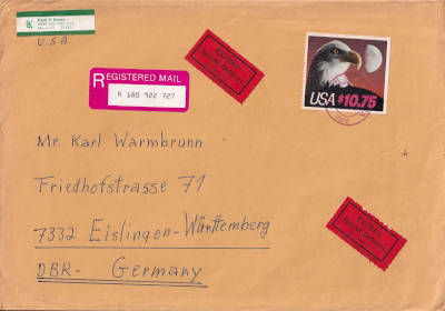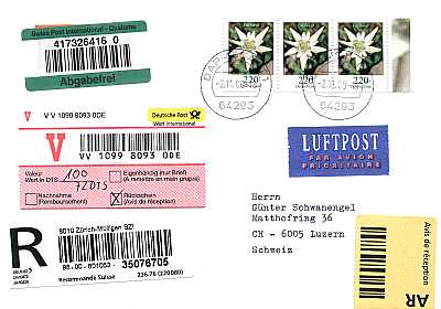 Cover with registeration, personal delivery, airmail and advice of delivery |