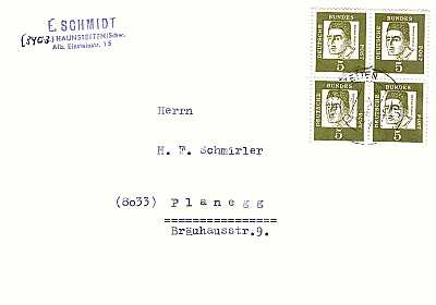 Inlandsbrief (1-20 g) vom 04.02.1964 (3. Periode) frankiert mit 4 Marken 5 Pfennig (=20 Pfennig) |