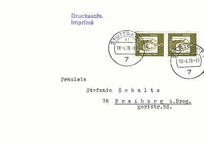 Inlandsdrucksache (1-20 g) vom 10.04.1970 (4. Periode) frankiert mit 2 Marken a 5 Pfennig (=10 Pfennig) |