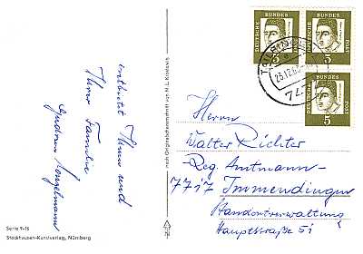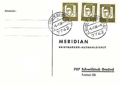 unterfrankierte Inlandspostkarte vom 05.07.1966 (4. Periode) frankiert mit 3 Marken a 5 Pfennig (=15 Pfennig anstatt 20 Pfennig, ohne Nachgebühr zugestellt) |