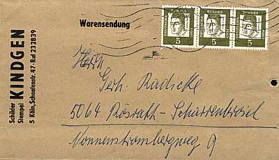 Inlandswarensendung (21-50 g) vom 09.02.1965 (3. Periode) frankiert mit 3 Marken a 5 Pfennig (=15 Pfennig) |