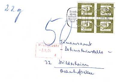 unterfrankierter Inlandsbrief (22 g) vom 02.03.1964 (3. Periode) frankiert mit 4 Marken a 5 Pfennig (=20 Pfennig; 50 Nachgebühr = 20 fehlendes Porto 30 Strafgebühr) |