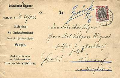 Inlandsbrief mit Zustellungsurkunde (1-20 g) vom 16.06.1902 frankiert mit einer Marke a 40 Pfennig (=40 Pfennig, 10 Brief 20 Zustellung 10 Urkunde)