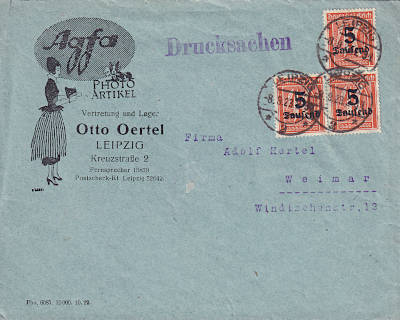Inlandsdrucksache (1-25 g) vom 08.09.1923 (17. Periode) frankiert mit 3 Marken a 5 000 Mark auf 40 Pfennig (=15 000 Mark)