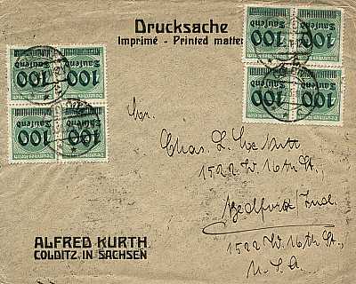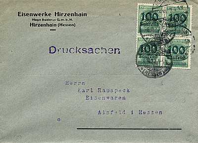Inlandsdrucksache (1-25 g) vom 06.10.1923 (19. Periode) frankiert mit 4 Marken a 100 000 Mark auf 400 Mark (=400 000 Mark) |